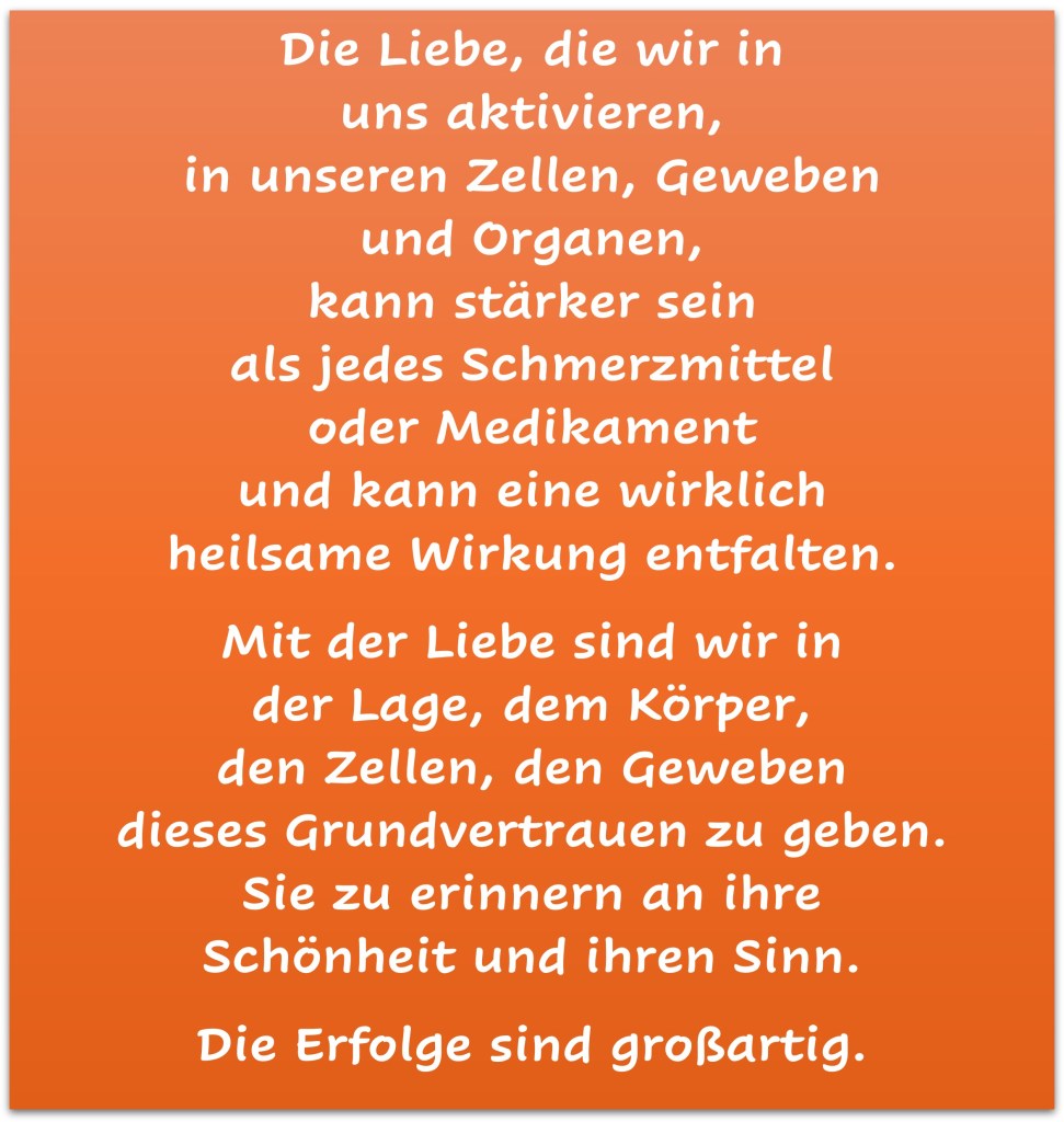 Am Sonntag, 28.12. (10- ca. 16 Uhr) beim Workshop lernst du, wie du selbst dafür sorgen kannst, dass Organe oder auch Situationen durch Liebe viel leichter heilen können. Jeder kann für sich am nächsten Tag diese Selbstheilungs-Liebe lernen, damit es den Organen oder deinen Herausforderungen wieder gut gehen darf.